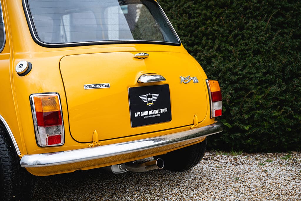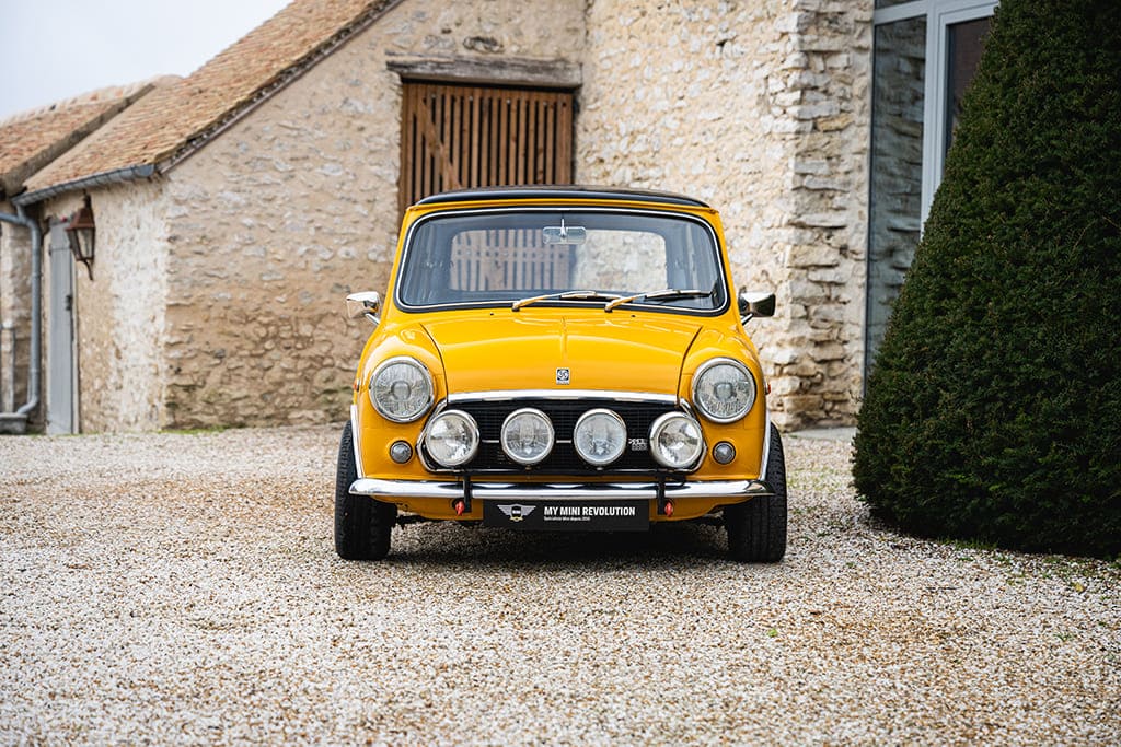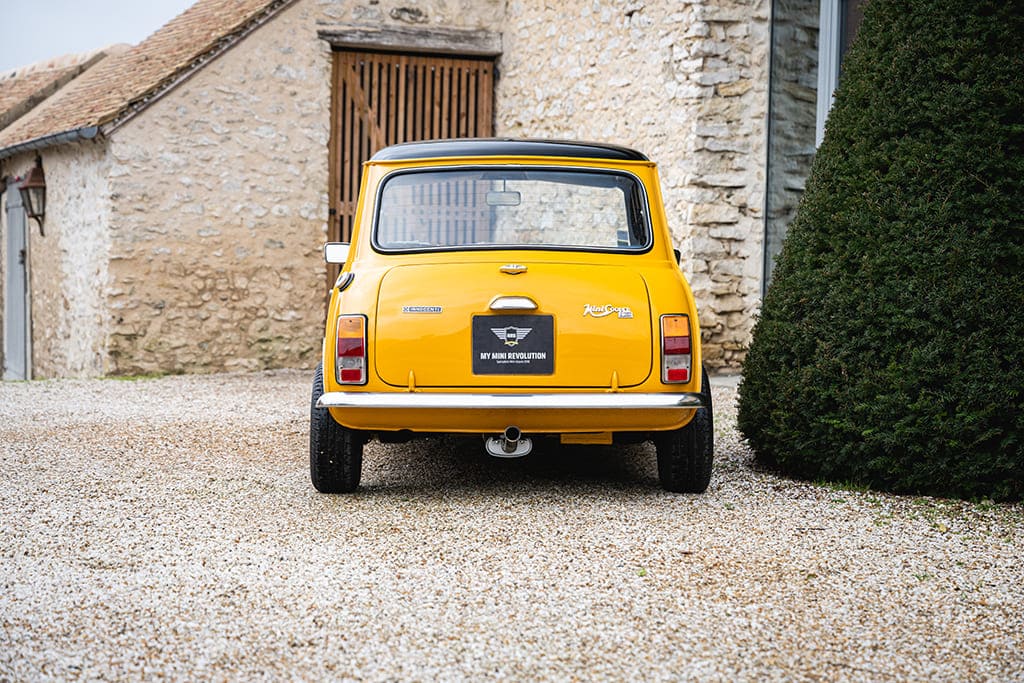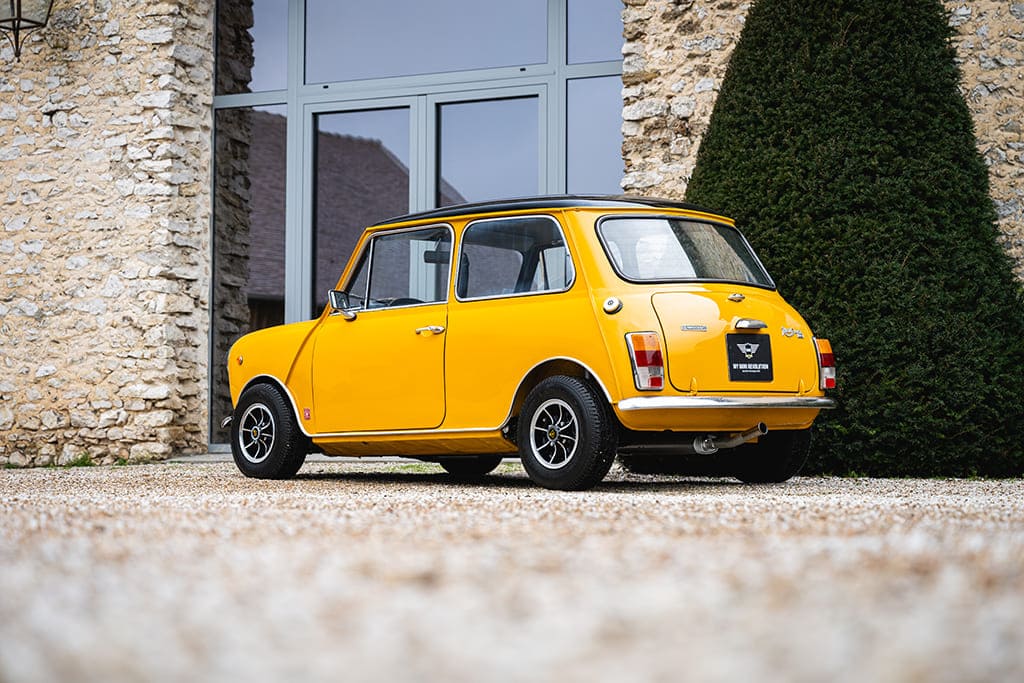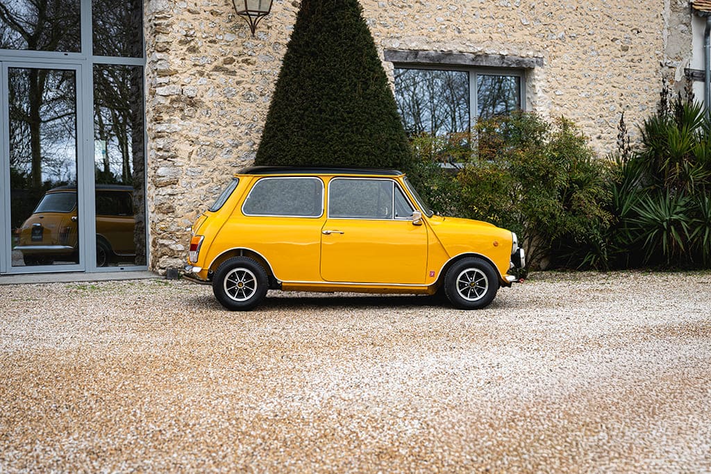 Mini Cooper 1300 Innocenti, Amarillo Italia (Giallo Ocra), 1974, usado, a la venta en nuestra sala de exposición. Pieza de colección excepcional, parte de la colección Mini Classics. My Mini Revolution, París, Houdan Bazainville. Compra y vende.