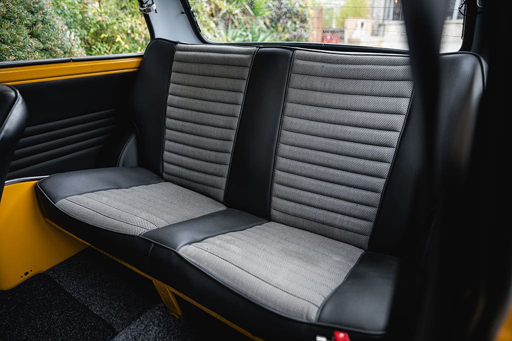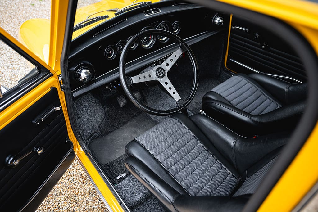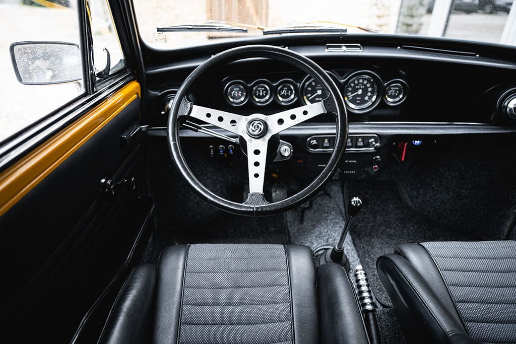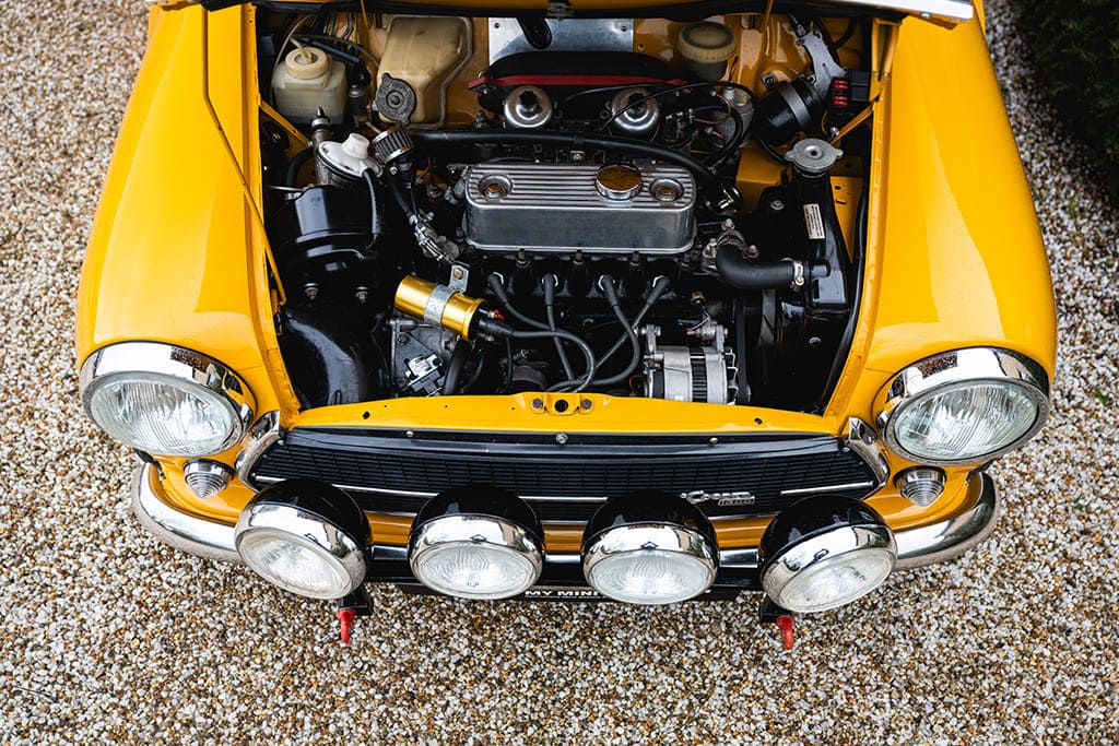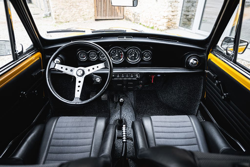 En el aspecto mecánico, tenemos un montaje divertido, eficaz y vivaz: preparación de 90 CV, dos carburadores HS4, árbol de levas, volante motor ligero… Resultado: un Mini ligero, reactivo, con una respuesta real y un carácter “rally” perfectamente utilizable.